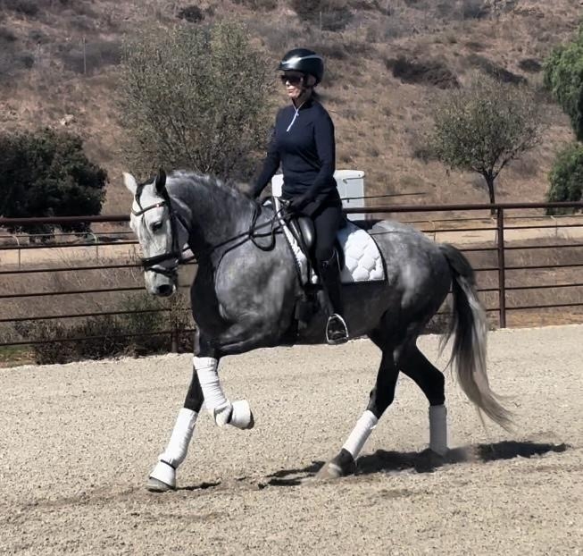 2019, 16 hands, dark grey PRE mare with excellent bloodlines Kabileño VIII - Atlántico PAL with three quality gaits, a super walk, great canter and expressive trot with a nice trot extension. She is very willing, smart, brave, levelheaded and is extremely comfortable to ride with a forward thinking mindset. She is first level schooling second/third level movements and has a good start on a flying change. She is very good on trails, cavalettis, riding in new places and would do well for an amatuer or junior rider in a training program that wants to move up the levels. She is showing good potential to be a FEI horse , is sweet, easy to handle, a barn favorite that’s very personable and connects with her person. Located in Los Angeles area